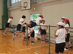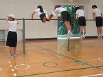 授業の後半では、ペアになり「友だちと一緒に着地できるかな」という課題に取り組みました。ペアの友だちも意識しつつピタッと着地しなければならないので、子どもたちはどうやってしたら着地が合うのかを考えていました。