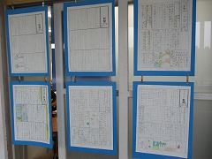 5年生の廊下に、先日の社会見学で学んだことをまとめた新聞が掲示されています。