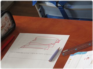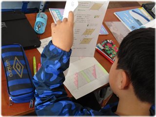 1つのクラスを2つに分け、少人数で学んでいます。今まで「たて、よこ」の表現も「底辺・高さ」という数学的な用語も入りました。単元が進むにつれて、様々な図形を学びます。