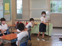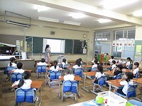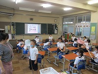 1年生は、美味しい学校給食について、栄養の先生からいろいろなお話を聞きました。子どもたちは、普段は見たことのない大きな調理道具などを実際に見て、家で使っているものとの違いを、体で実感していました。改めて、給食を残さず食べようという気持ちを持つことができました。