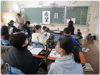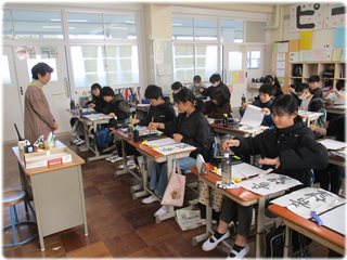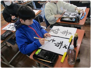 毛筆は、地域のゲストティーチャーの方にもご指導いただきながらです。「姿勢を正しく、新たな気持ちで・・・はい、始めましょう」と声がかかると、子どもたちの「すうーっ」と息を吸う声が聞こえてきます。勢いづけて、「えいっ」と一画目の筆を置き、書き進めます。