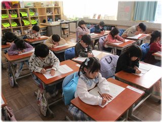 硬筆も一層、緊張感漂う雰囲気でした。間違えてはならない、真剣勝負です。話し声も、小声です。教師が、「始めましょう」を言うと、一斉に書き出しました。