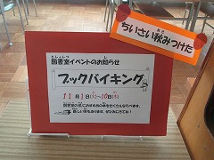 図書室では、「ブックバイキング」が行われ、各テーブルにテーマ別に選ばれた本が並べられています。