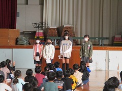 次に、三泗小中科学展入選3名、三泗小中社会科作品展入選2名、良い歯のポスター入選3名、良い歯のコンクール1名、三泗陸上記録会100m走入賞1名の表彰をしました。様々な分野でしっかり力を発揮してくれたことを嬉しく思います。
