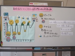 2学期の発育測定のあと、睡眠について全学年学習しました。テーマは「ねむるといいこといっぱい!すいみん列車の旅」です。人間の睡眠には、深い眠りと浅い眠りがあることを伝え、寝始め1~3時間の深い眠りのときは成長ホルモンがたくさんもらえること、深い眠りでは「げんき玉(脳や体のつかれをとる)」、浅い眠りでは「わかる玉(勉強したことや覚えたことを整理・記憶する)」がもらえること、また、真夜中には風邪の予防や心を安定させる働きのある「ホッとくん(メラトニン)」も放出され、早くねむると私たちのからだにとってよいことがたくさんあることを学びました。全学年、1週間「ねむるといいこといっぱいチャレンジ」に取り組みます。お子さまが早く寝られるよう、おうちでもぜひご協力をお願いします。