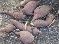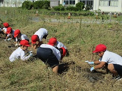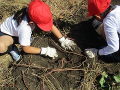 1年生が南庭の畑で育ててきたサツマイモを収穫しました。