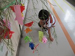 明日は七夕。低学年の子どもたちが樋口さんからいただいた笹で七夕飾りを作りました。子どもたちは、色とりどりの折り紙を折ったり切ったりして飾りを作りました。そして、短冊に願いごとを書いて飾りました。