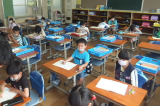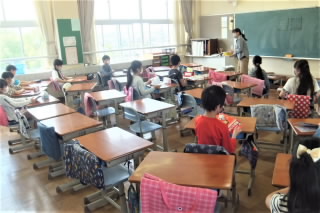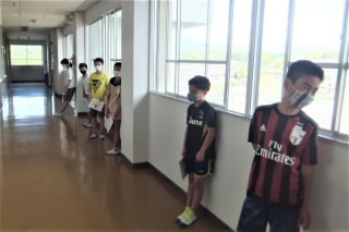 教室内で行う授業では、机の配置にも注意しています。できるだけ前後の間隔を空け、密にならないようにしています。写真3枚目の6年生は廊下に立たされている?いえいえ、これは先生にノートを見てもらうための列で、前後の間隔を空けていたら列が廊下まで伸びてしまっただけなのです。でも、子どもたちは間を空けるのは当然という雰囲気で、きちんと並んでいました。