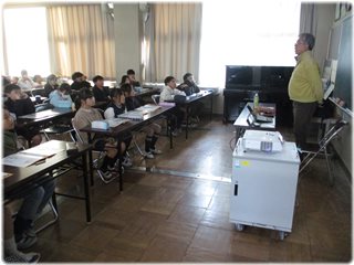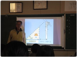 防災教室として四日市大学の鬼頭教授に「大きな災害がおこったら?~小学生のきみたちができること~」という学習で授業をしていただきました。どちらの学年も、これまでに鬼頭教授から防災学習を受けています。今回は、まずは、落雷の危険性について「防災ノート」をつかって、どのように身を守ればよいか、を考える活動からでした。高いところに落ちること、人間の体を電気が伝って感電することを教えてもらいました。だから、まずはたてもの中に逃げることを学習しました。