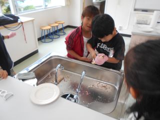 子どもたちは、サツマイモの皮をピーラーでむきました。