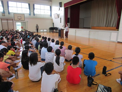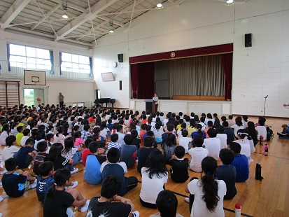校長からは、『夏休みモード』から心も体も切り替えるためには、「朝・昼・晩のごはんをしっかりと食べること」「早寝早起きを心掛け、質の良い睡眠をとること」が大切であると話をしました。