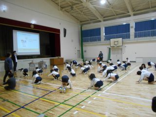 2年生の児童も話を聞いて、実際に「体を育てる運動」として、「ロケットのポーズ」をしたり、「どうぶつ歩き」をしたりして、自分の体の動きを確かめました。