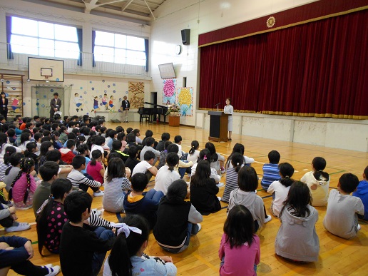 まず初めに、新しく三重西小学校に赴任した新しい先生方との出会いの式、着任式を行いました。今年は12名の職員が新しく赴任しました。今日配布したお便りに紹介していますのでご覧ください。