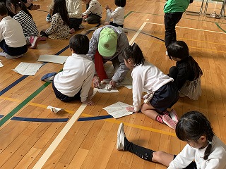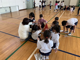 また、3限目は体育館で昔の遊びを教えていただきました。どの子もとっても楽しそうに、いろんな遊びを教えていただいていました。