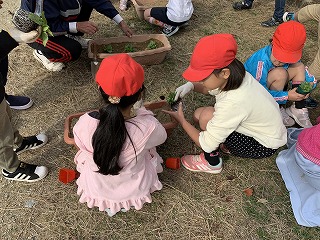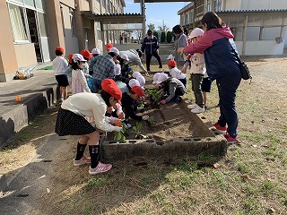 2限目は、1年生の花壇やプランターに花の苗を植えました。いきいきサロンの皆様にお世話になって、上手に花の苗を植えることができました。