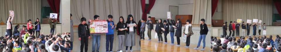 委員会活動に関するお知らせや守ってほしいことなどを、役割分担をしながらクイズや発表を通して全校に発信しました。