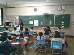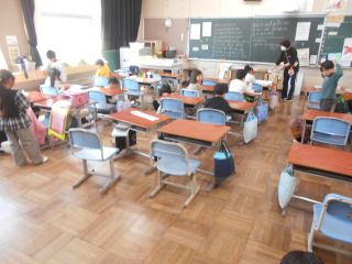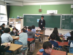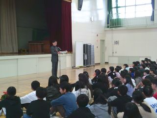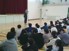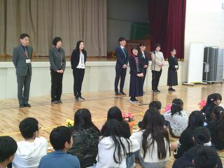 続いて離任式を行いました。去られる先生方からあいさつをいただき、子どもたちは寂しげにそれを聞いていました。