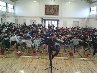最後に、みんなで命を大切にするようにTIMさんの「命」のポーズを全校でしました。