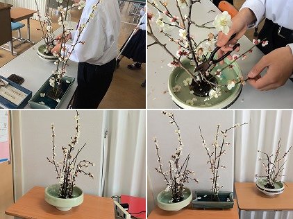 梅の花を花器に自由に生けました。梅の花が明日の4限目の10組のお別れ会に花を添えてくれます!初めて剣山や花器の扱いでしたがとても丁寧にできました!