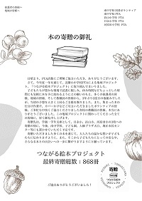 南中学校図書ボランティアと日永小、泊山小、河原田小PTAが主催で昨年夏からはじめたつながる絵本プロジェクトからプロジェクトの結果とお礼のリーフレットが届きました。