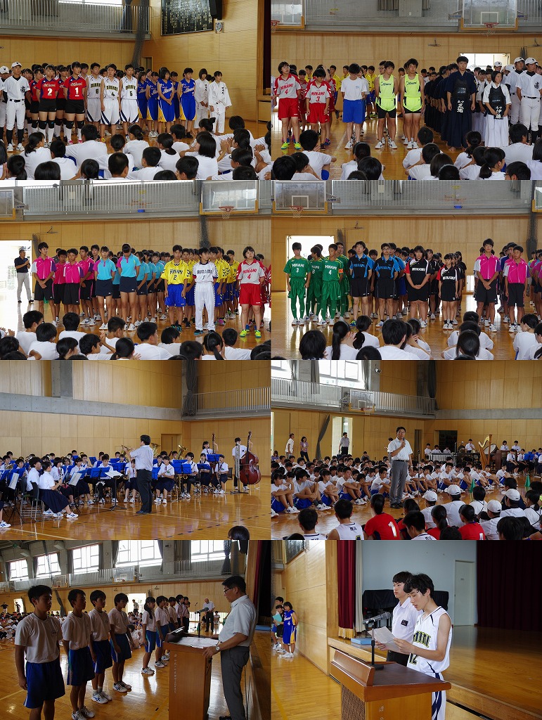今日は今週末から始まる中体連総体三泗予選や来月の吹奏楽コンクールに向けての壮行会がありました。各部からの力強い決意表明を聞くことができました。その後生徒会本部から,今年度の行事テーマ「涙奏走 ~肝心なのは はじめの一歩~」が発表されました。みんなの力で,うれし涙が出るような体育祭・文化祭にしようという思いのこもったテーマになっています。最後に表彰伝達と安全委員会から登下校に関する連絡がありました。