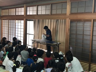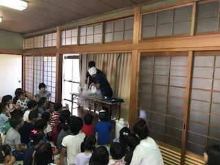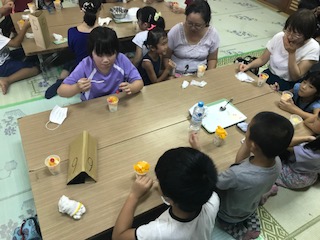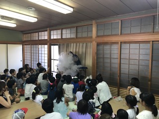 今日は人権プラザ天白で行われたキッズスクールに本校の先生たちがサイエンスショーの講師として参加しました。液体窒素を用いた実験を,参加した児童生徒約80名の前で行いました。万が一こぼしてしまって目に入ると危険なので,前から2.3列目までの児童には安全眼鏡を装着してもらい,ました。南中のでんじろう先生は白衣こそ着ていませんが,まさにでんじろう先生のごとく,花びらをこっぱみじんにして見せたり,バナナで釘を木に打ち付けたり,アイスクリームを作って拍手喝さいを浴びていました。その後,液体窒素で凍らせた果物を使って,各自でパフェを作って試食しました。