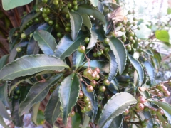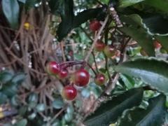 そして、こちらが「千両(せんりょう)」で、実は葉の上に固まって付いています。