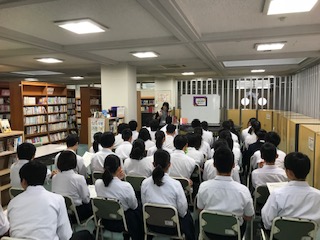 今日は3年生を対象に,図書館司書の荒木さんにブックトークをしていただきました。今日のテーマは「古典の世界を楽しもう!」