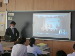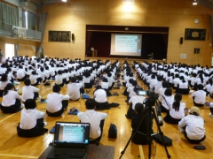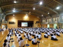 本日6限目、11月の生徒集会を行いました。11月の生徒集会は、美化委員会と図書委員会からの報告です。1,3年生が体育館に入り、2年生はリモート参加です。