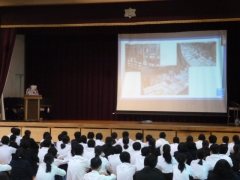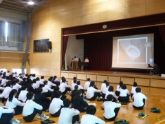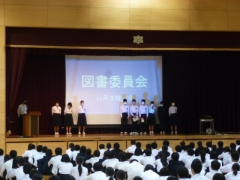 美化委員会より活動目標「南中ツルピカ大作戦 フルパワー~整理整頓を意識して、過ごしやすい環境をつくろう~」の発表の後、「トイレ掃除の仕方」についての説明がありました。図書委員会からは「メディアセンターに関するクイズ」と、図書委員会企画「ビブリオバトル」の紹介、図書委員会による「おすすめの本紹介」などを行いました。