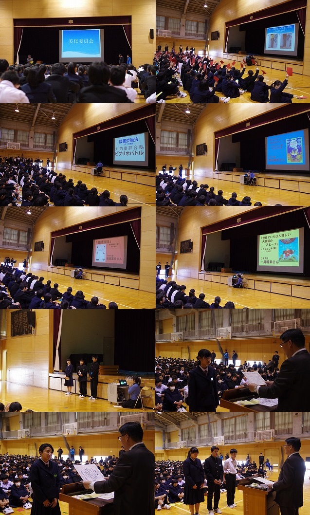 今日は生徒集会があり,美化委員会と図書委員会からの発表がありました。美化委員会からは美化キャンペーンの結果や
