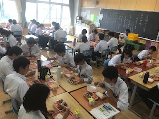 今日は中間テスト終了後に,デリバリー給食の全員喫食を行いました。今日のメニューは,米飯,牛乳,とんてき,ごまキャベツ,