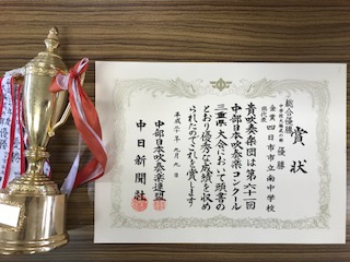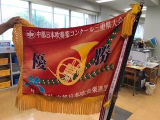 9月9日(日)に三重県総合文化センター大ホールで行われた中部日本吹奏楽コンクールにおいて,本校吹奏楽部が大編成の部で優勝し県代表となりました。他の編成も含めて総合優勝となり,優勝旗もいただきました。10月6日に石川県の金沢歌劇座で行われる本大会に三重県代表として出場します。