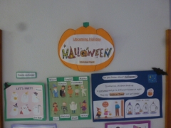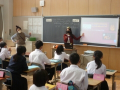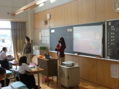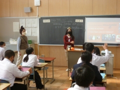 1年生英語科の授業の様子です。この時間は、ハロウィンを題材にキャリー先生も仮装(?)しての授業です。