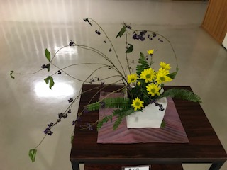 今回の作品は,紫式部,菊,玉しだを使った作品です。菊の黄色のインパクトが強いですが,