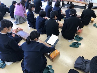 今日は2年生が邦楽鑑賞と体験を行いました。最初に演奏を聴かせていただきましたが,お正月のテレビ番組や