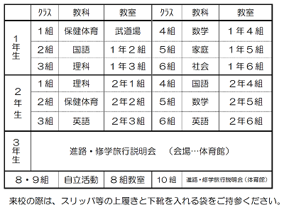 17日(金)の5限目、3年生進路・修学旅行説明会、1・2年生授業参観の予定です。
