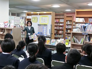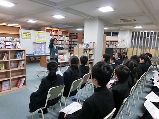 服部由起子さんから、メディアセンターの使い方、本の分類番号について、そして本の借り方についての説明がありました。