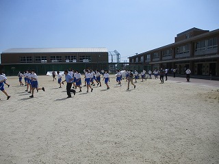地震が起こった想定で、机の下に身を隠し、グランドへ避難しました。