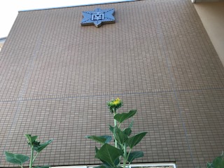 校舎西側の一番背の高いひまわりの花が黄色くほころんできました。