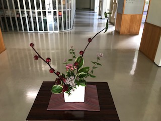 今回の作品は,ローゼル,藤袴,小菊,ぎぼしを使った作品です。ローゼルの独特の赤紫色が