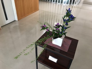 今回は,紫と青紫がかった2色のりんどうと雪柳を使った奥行きのある作品となっています。