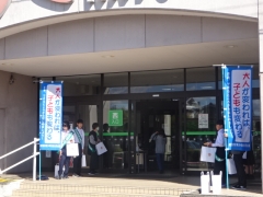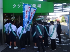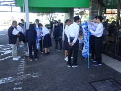 爽やかな秋晴れの中、10時より日永カヨー店の入口にて、新旧生徒会本部8名の皆さんがリーフレット等の配布を行いました。最初は戸惑いもありましたが、気持ちの良いあいさつと爽やかな笑顔で啓発活動ができました。今年度は、笹川中学校生徒会の皆さんと一緒に活動を行いました。