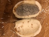 「アケビ」という名の由来は、秋に楕円形の果実がつき、熟すと縦に割れて白くて甘い果肉と黒い種子を覗かせる様子から、「開け実」の意味で名付けられたようです。つる性の落葉の本木(低木)で[、茎は蔓になって左巻き(Z巻き)に他の植物などに巻き付きます。果期は9~10月で、中の白い部分が、昔から山遊びする子どもの絶好のおやつとして親しまれてきました。味は、白い果肉はとろりとした爽やかな甘みがあり、黒い種子は苦味があるので除かれます。
