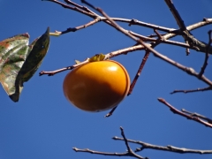 散歩中、秋の日差しに照らされた柿の実に出会いました。