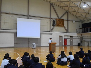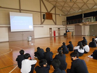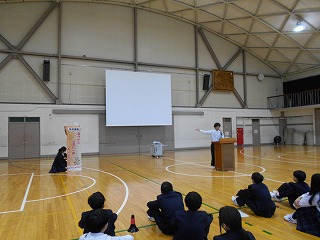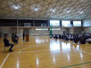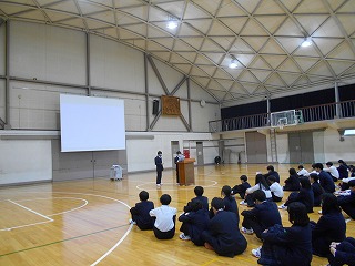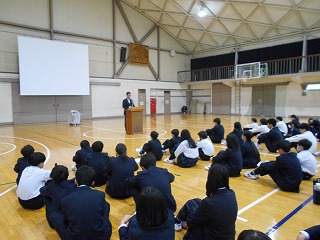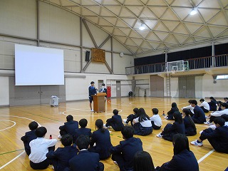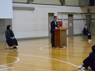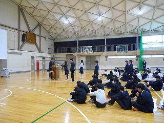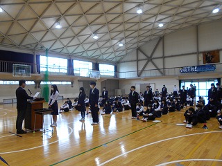 表彰伝達式に続き「修了式」を行いました。令和7年度が平和に「修了式」を迎えることができたのも、生徒のみなさんのがんばりや保護者・地域のみなさんのサポートのおかげです。校長からは、「これからも伝統のあいさつを大切にすること。」と、「地域行事のボランティアとして活躍する姿を期待している。」とお話しがありました。水谷先生からは、「春休みの過ごし方」についての注意点の指導がありました。