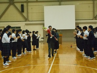 「修了式」に続いて「離任式」を行いました。今年度は、7名の教職員が退職・異動をすることとなりました。詳しくは、「学校だよりNo.12」を参照してください。今日は、会場にみえた4名の教職員が一人ひとりずつ生徒にメッセージを伝えました。その後、代表の生徒から花束が贈呈され、思わず目頭が熱くなるシーンとなりました。最後に「花道」を通って、港中学校を離任されていきました。「出逢い」と「別れ」は人生にはつきものですが、共に過ごした時間はお互いの共通の思い出です。これまで大変お世話になり、ありがとうございました!また、いつか逢うその日まで!!
