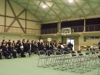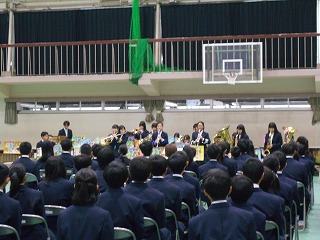 「修了式」に続いて「離任式」を行いました。今年度は、7名の教職員が退職・異動をすることとなりました。詳しくは、「学校だよりNo.12」を参照してください。今日は、会場にみえた4名の教職員が一人ひとりずつ生徒にメッセージを伝えました。その後、代表の生徒から花束が贈呈され、思わず目頭が熱くなるシーンとなりました。最後に「花道」を通って、港中学校を離任されていきました。「出逢い」と「別れ」は人生にはつきものですが、共に過ごした時間はお互いの共通の思い出です。これまで大変お世話になり、ありがとうございました!また、いつか逢うその日まで!!