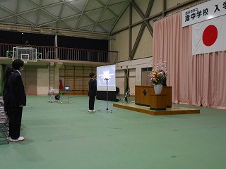 午後からは、入学式を行いました。今年は、63名の新入生が入学をしてくれました。3年生の代表生徒がリードをして、体育館に入場することができました。まだ少し大きめの制服に身を包む子どもたちの姿をみて、保護者のみなさまも目を細めて見つめていらっしゃいました。代表生徒の「誓いの言葉」も、「これから中学校でがんばるぞ!」という意気込みが表れていて、明日からの新入生の中学校生活が楽しみに思えてきました。校長からの「授業は大事!」という話に、うなずきながら聴く生徒の姿も目立ちました!最後に吹奏楽部による「祝賀演奏」で、盛大に式が幕を閉じました。