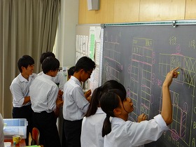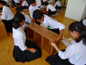 1クラスの人数が多いので教室内のロッカーの数が少なく、昨年は大変不便な思いをさせていました。今回、カラーボックスを25台購入し、みんなで組み立てました。組み立てた経験のない生徒が多い中、設計図を見ながら上手に組み立てていました。
